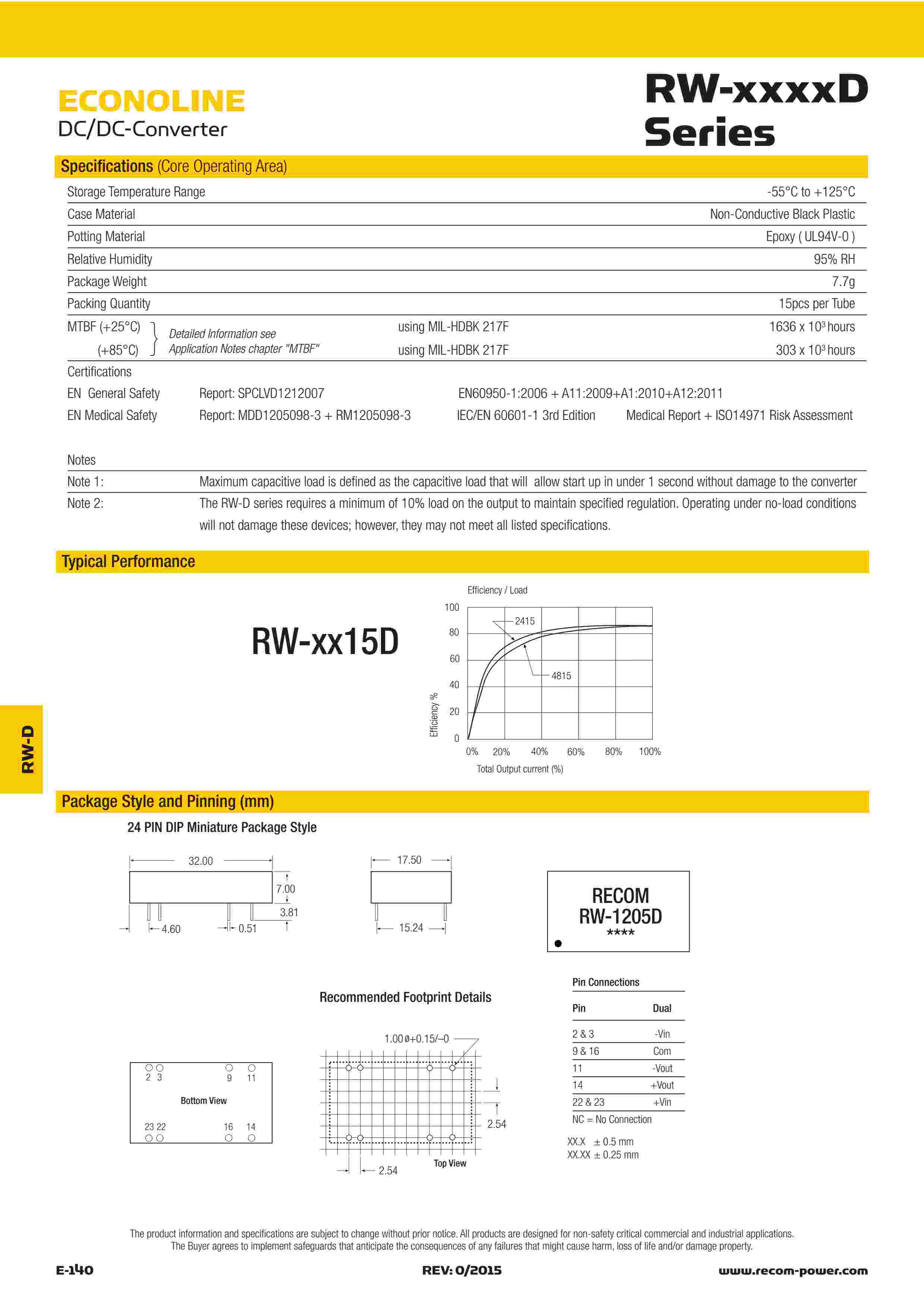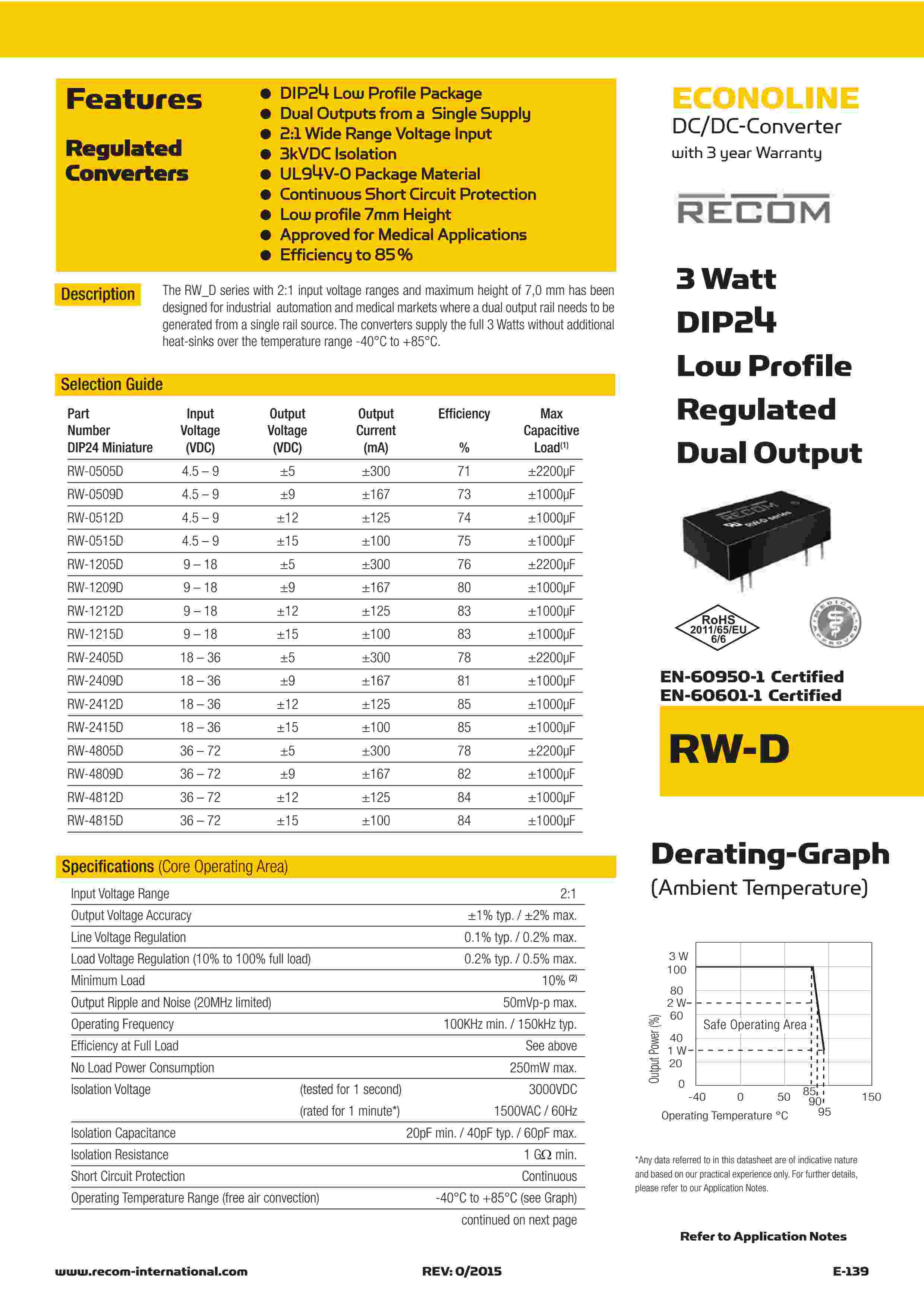 | describe: | DIP24 Low Profile Package● Dual Ouputs from a Single Supply● 2:1 Wide Range Voltage Input● 3kVDC Isolation● UL94V-0 Package Material● Continuous Short Circuit Protection● Low profile 7mm Height● Approved for Medical Applications● Efficiency to 85 % | ||