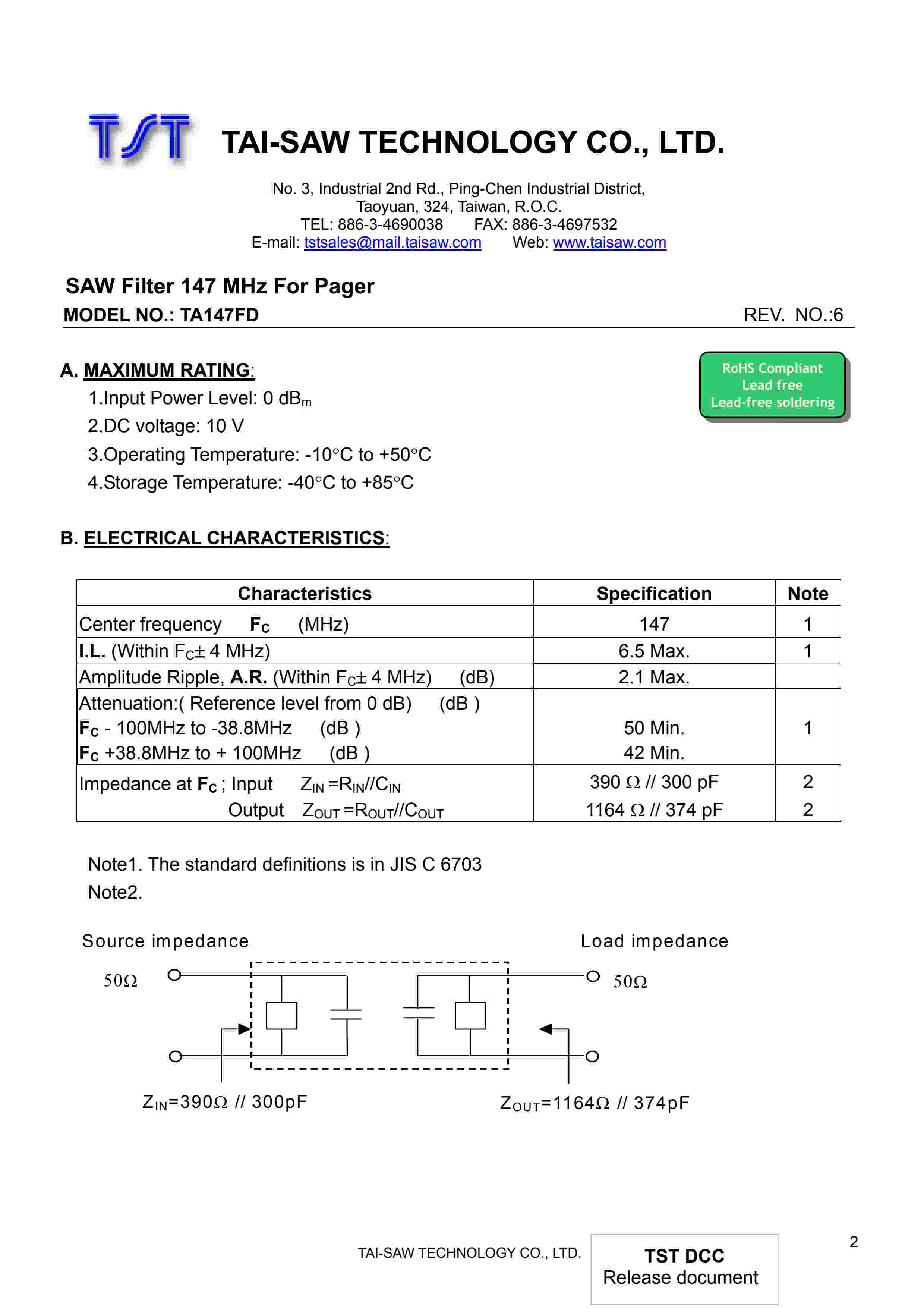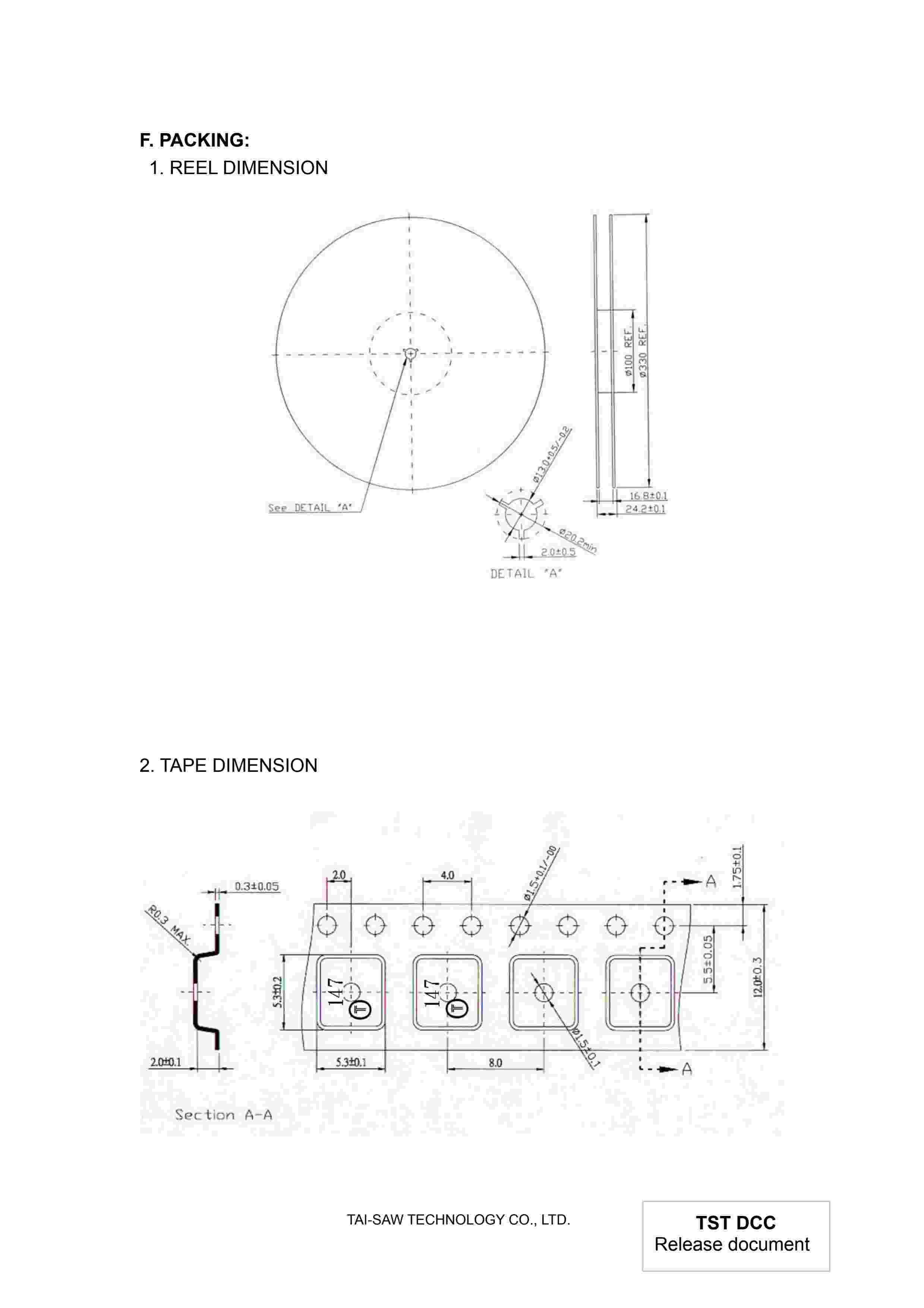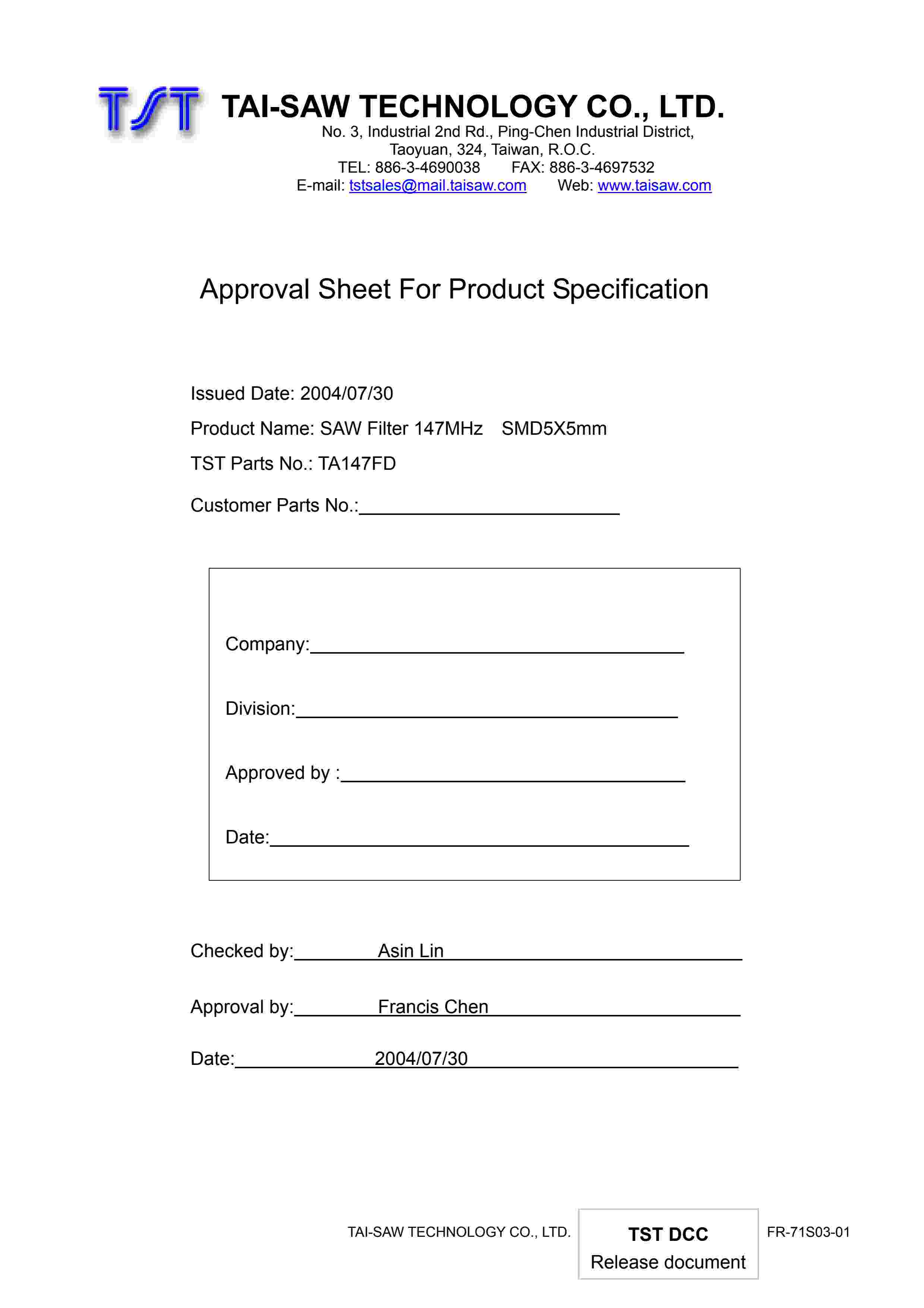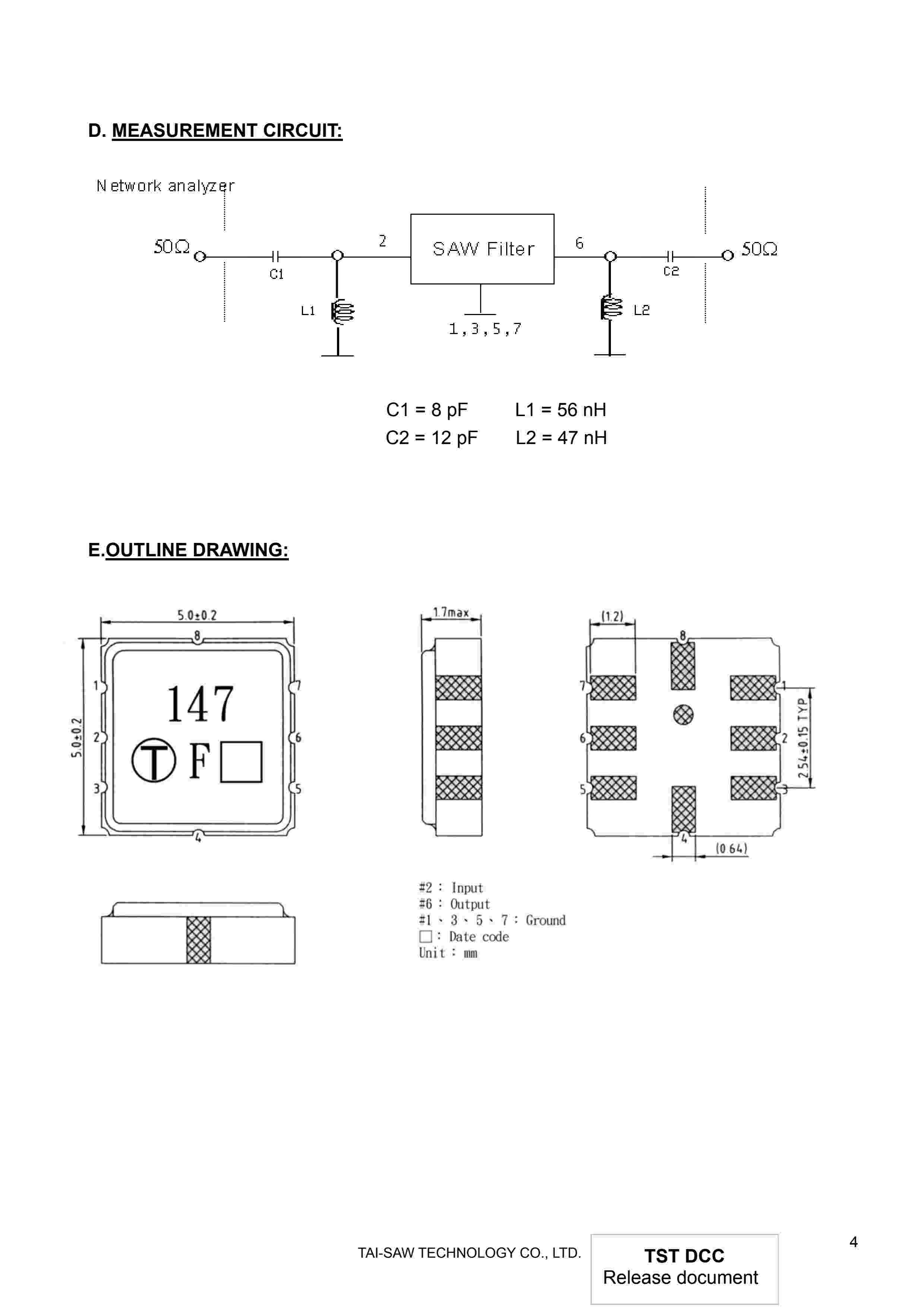 SAW Filter 147MHz TST Parts No.: TA147FD SMD5X5mm