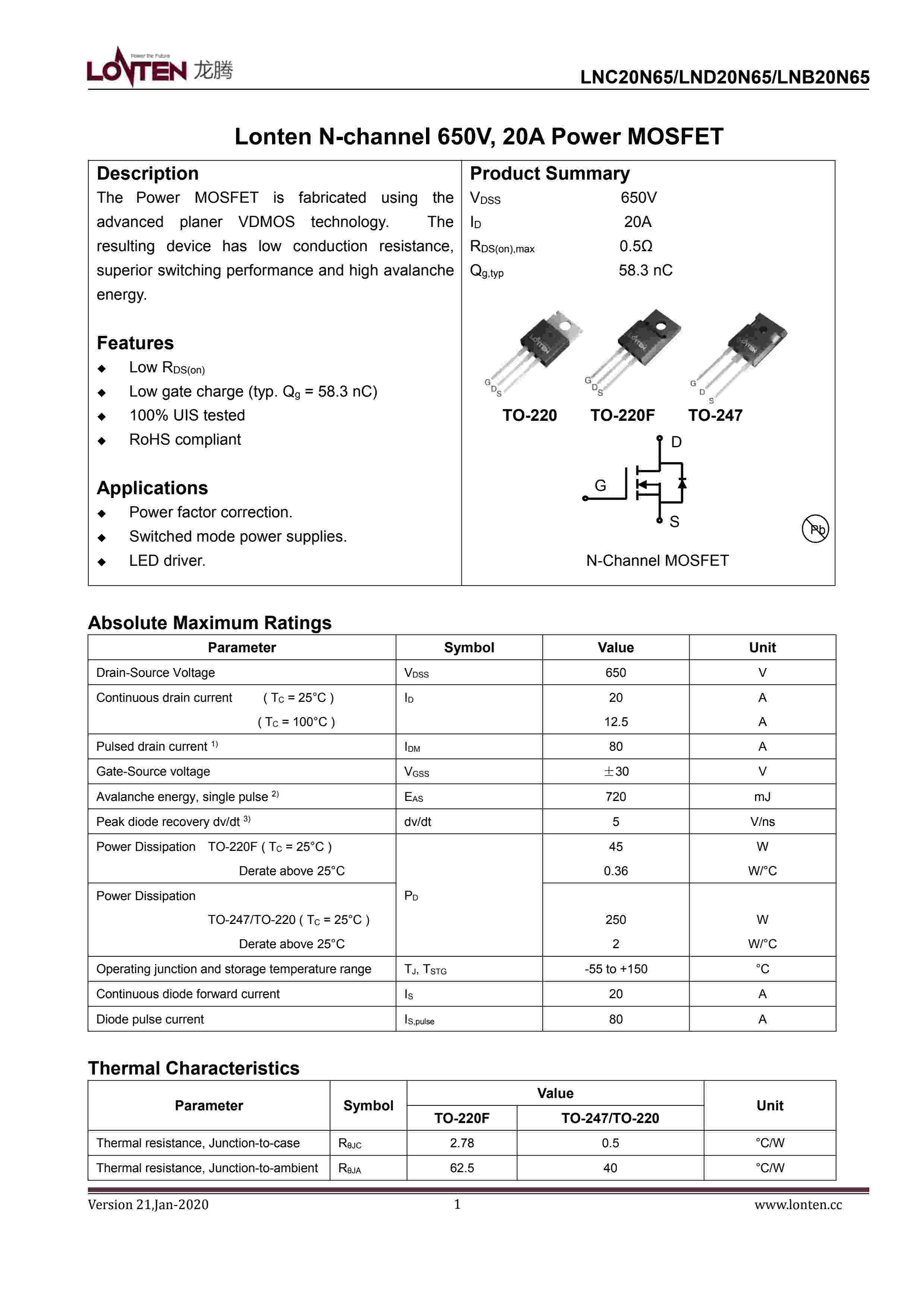Lonten N-channel 650V, 20A Power MOSFET