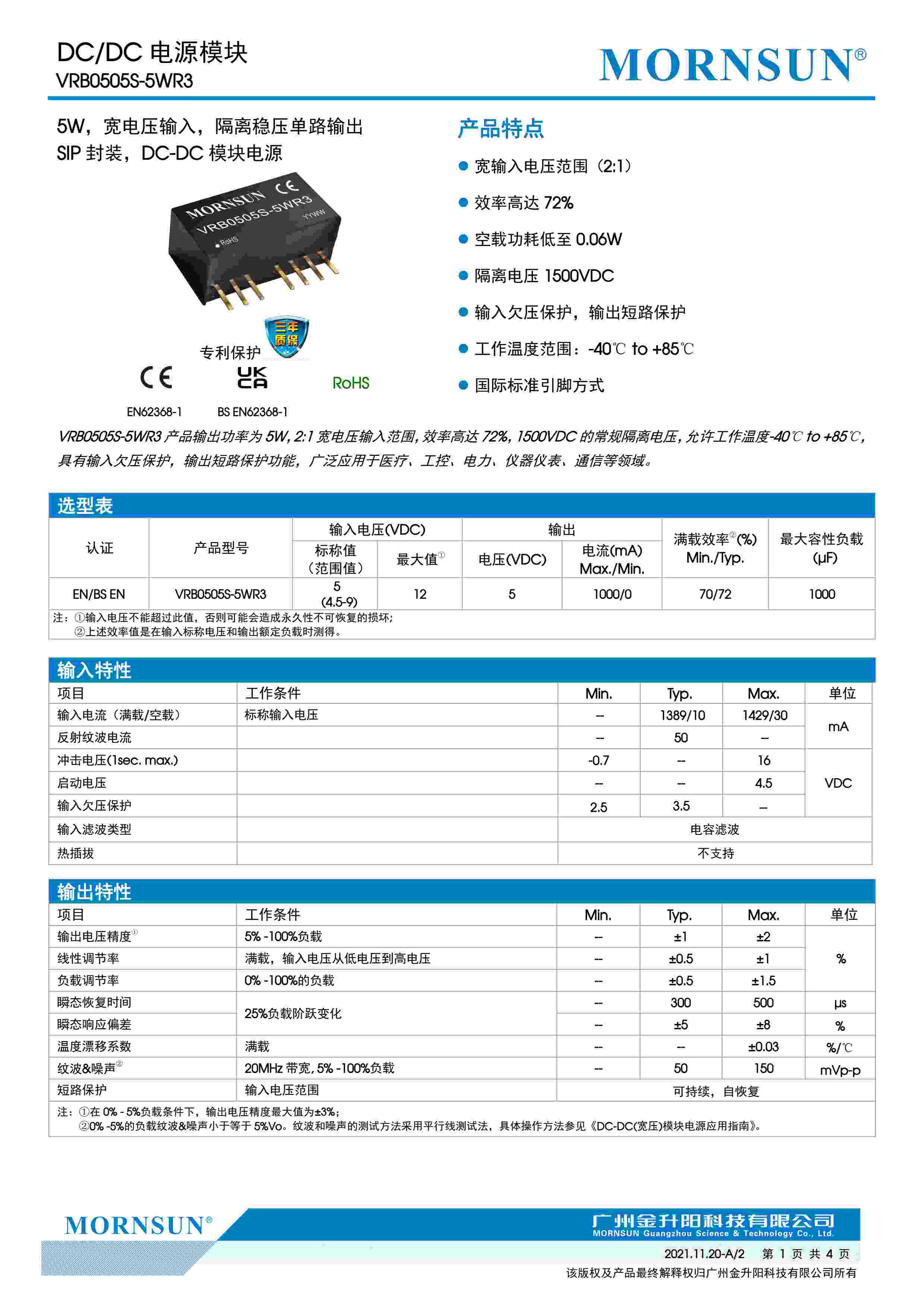 5W,宽电压输入,隔离稳压单路输出 SIP 封装,DC-DC 模块电源