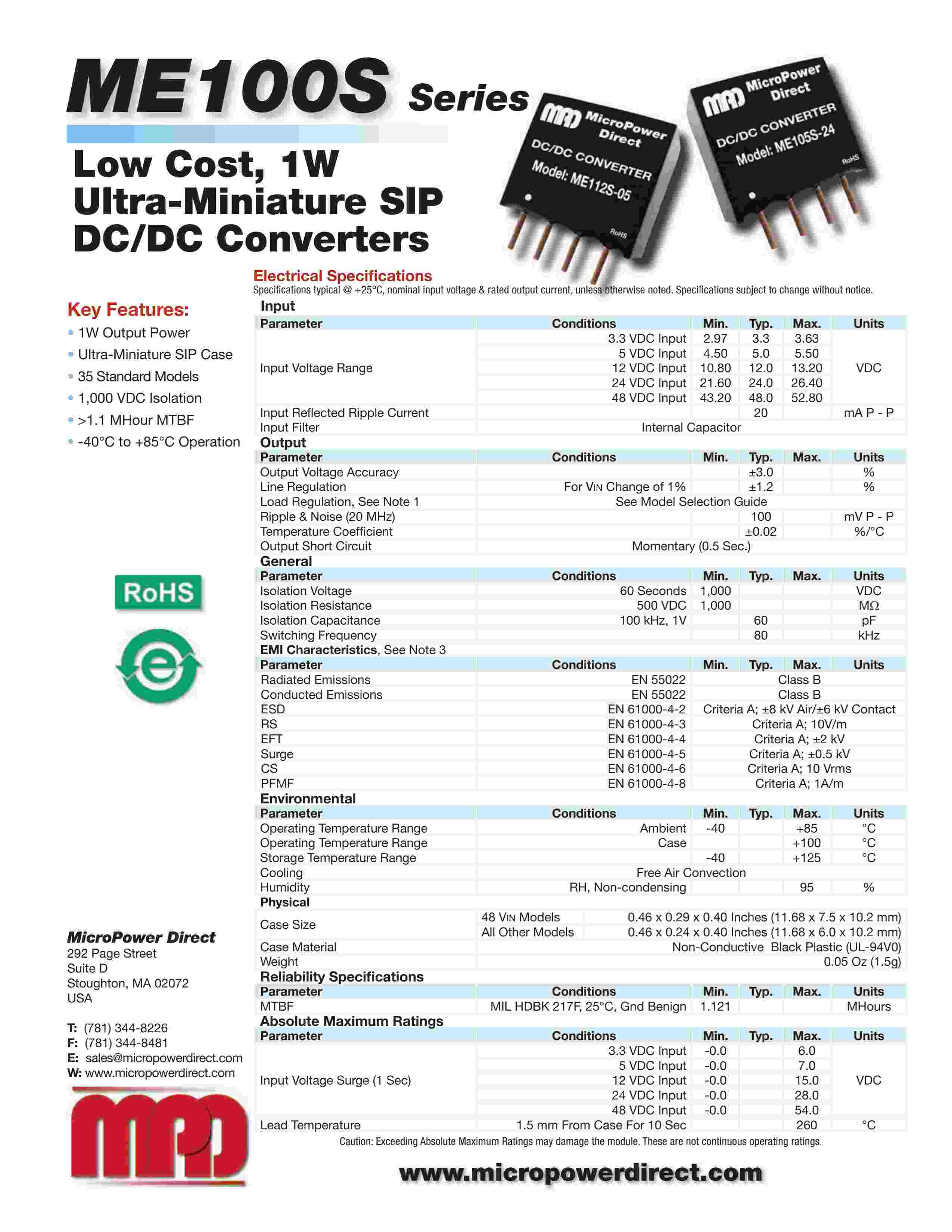 Low Cost, 1W Ultra-Miniature SIP DC/DC Con vert ers