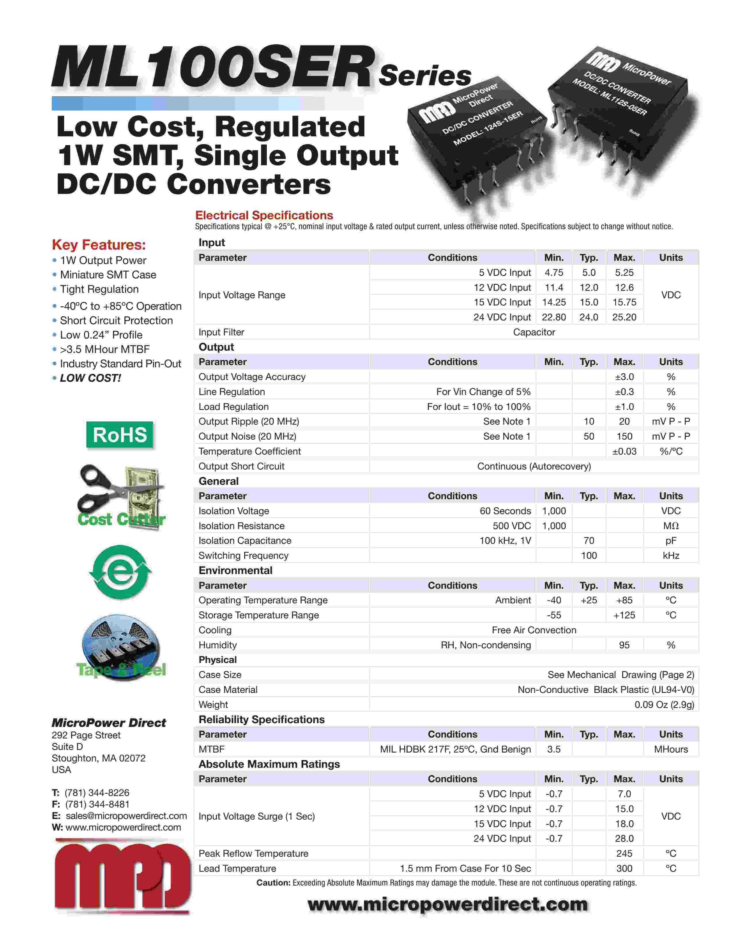 Low Cost, Regulated 1W SMT, Single Output DC/DC Con vert ers