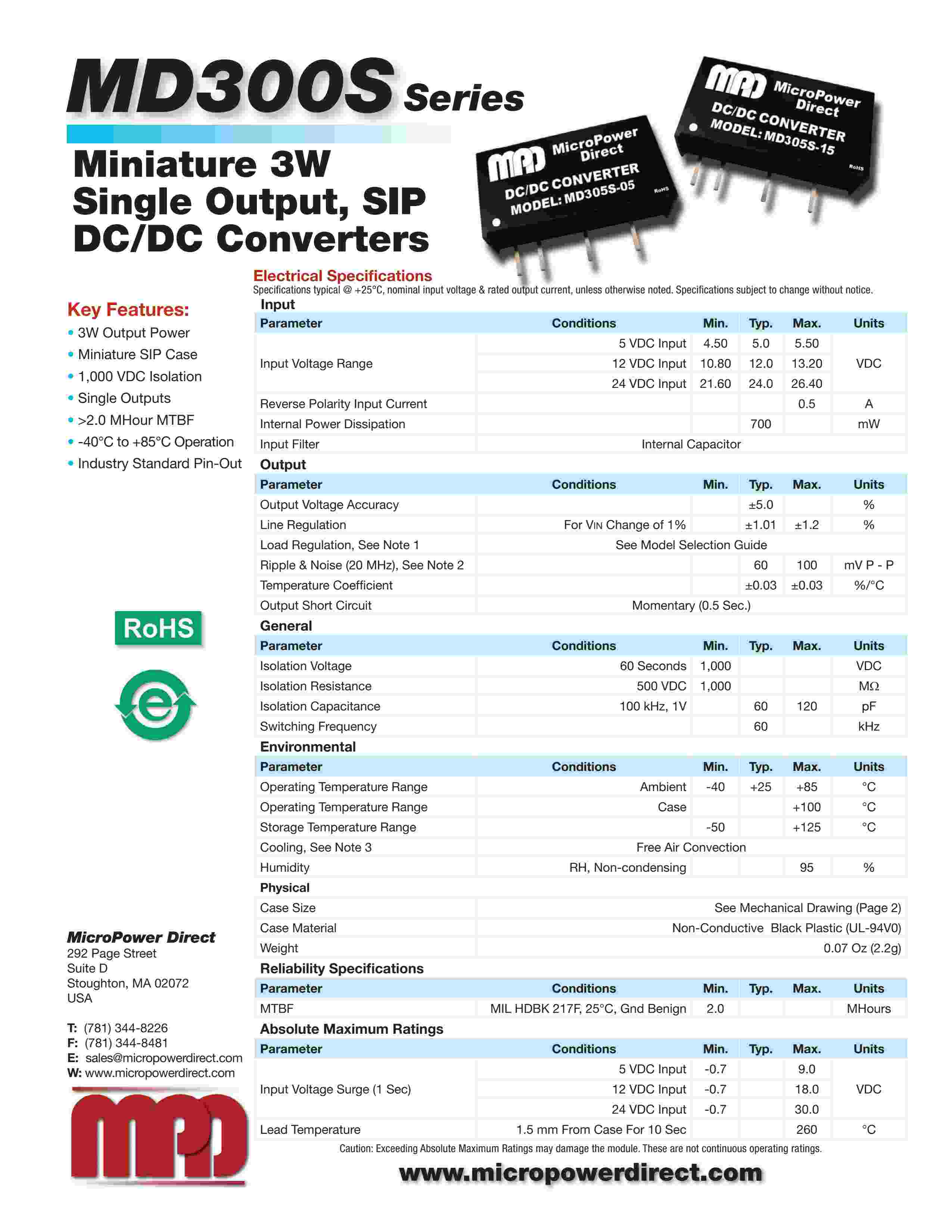 Miniature 3W Single Output, SIP DC/DC Con vert ers