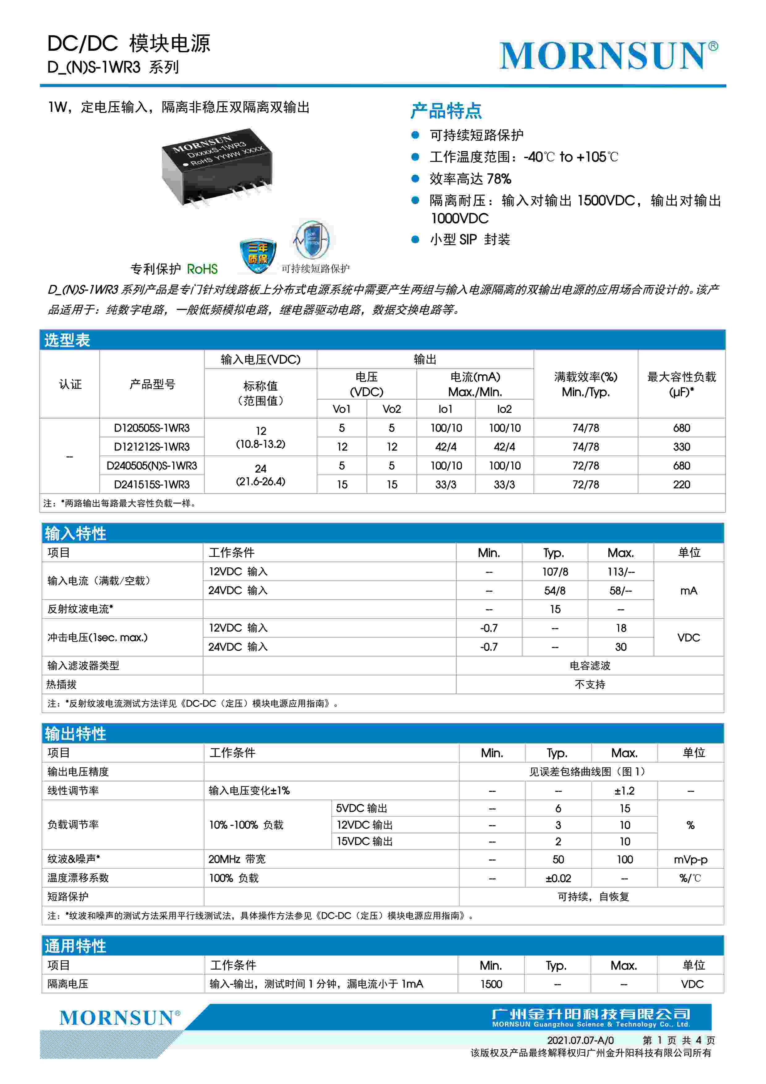 1W,定电压输入,隔离非稳压双隔离双输出