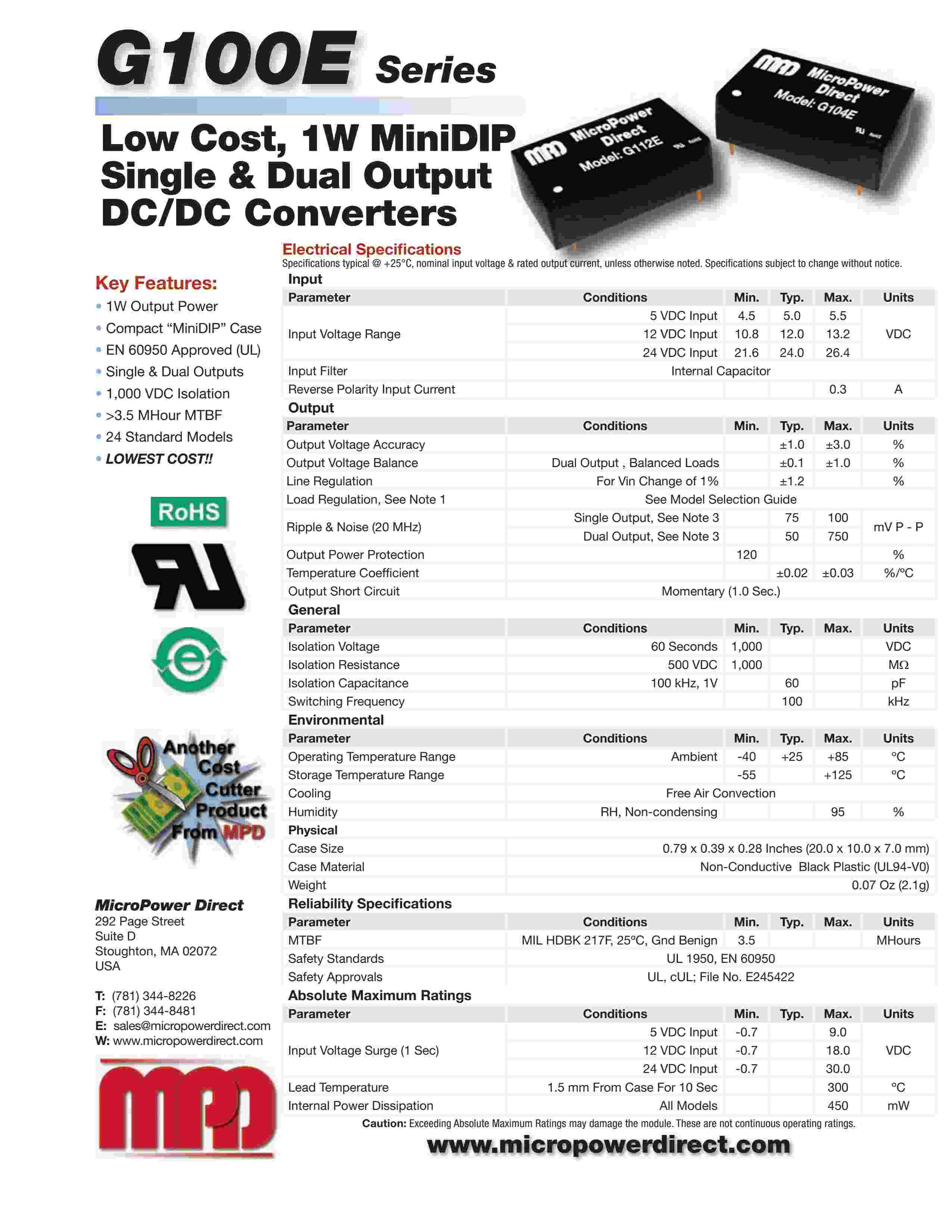 Low Cost, 1W MiniDIP Single & Dual Output DC/DC Con vert ers